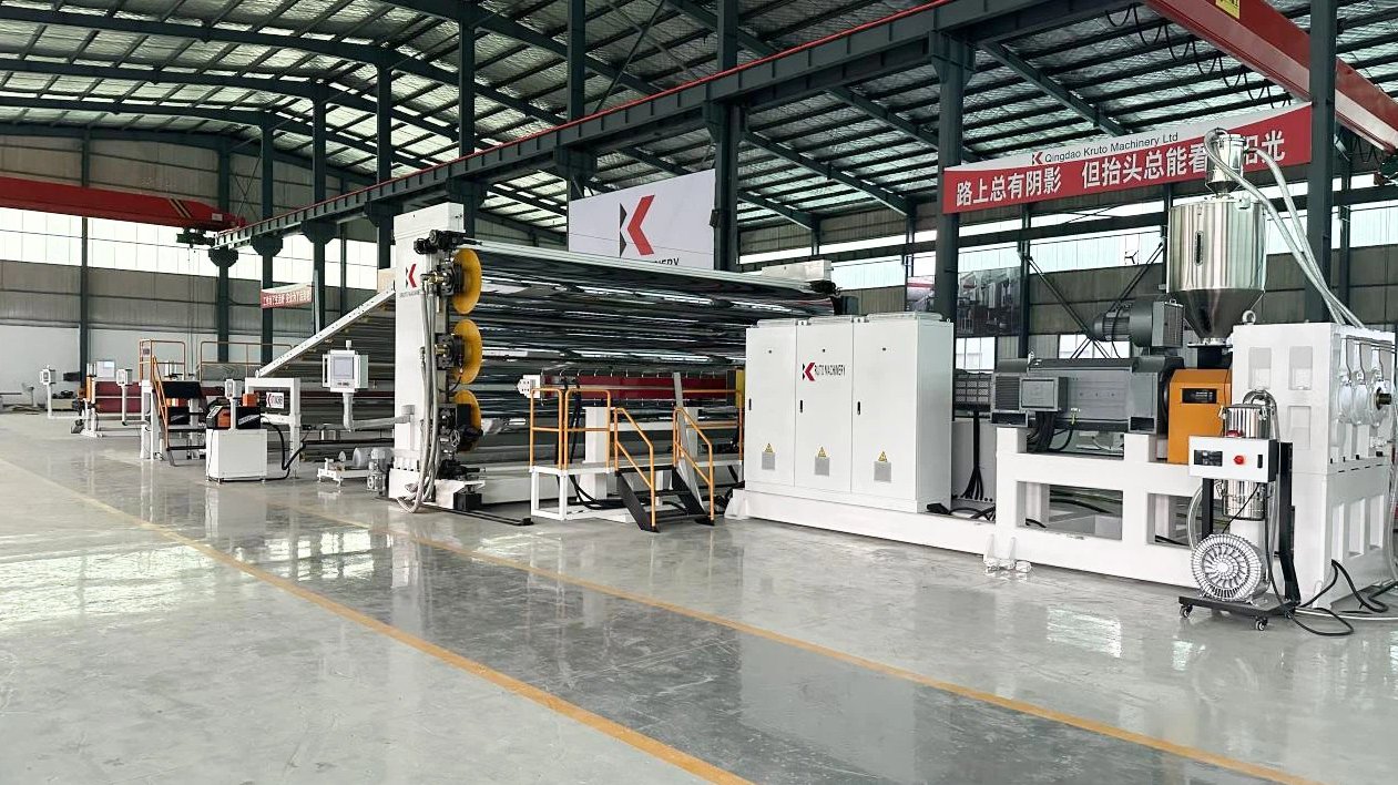 In 2022, Qingdao Kruto Machinery sold a 6000mm width, 0.5-3.0mm thickness HDPE/PE geomembrane sheet extrusion machine production line to our Russia customer. This extrusion machine production line, equipped with our own high-efficiency single-screw extruder, Siemens Beide main motor, JCTIMES die head, Switzerland MAAG gear pump, ABB frequency inverter, Japan NSK brand bearing, Schneider Contactor, Siemens PLC and other world famous brand devices, it can achieve almost 100% plasticization effect. It has high production efficiency, low energy consumption, and reduces raw material waste. The surface of the produced geomembrane sheet is smooth, the thickness is uniform and the tensile strength meets the requirements of customers and the market. It has received high praise from customers and the customer purchased another 6000mm width geomembrane sheet extrusion machine production line in 2020, which was put into market use. It has once again received satisfactory feedback from customers. Our factory will continue to provide high standards, high-quality equipment and comprehensive services to meet customers' needs.